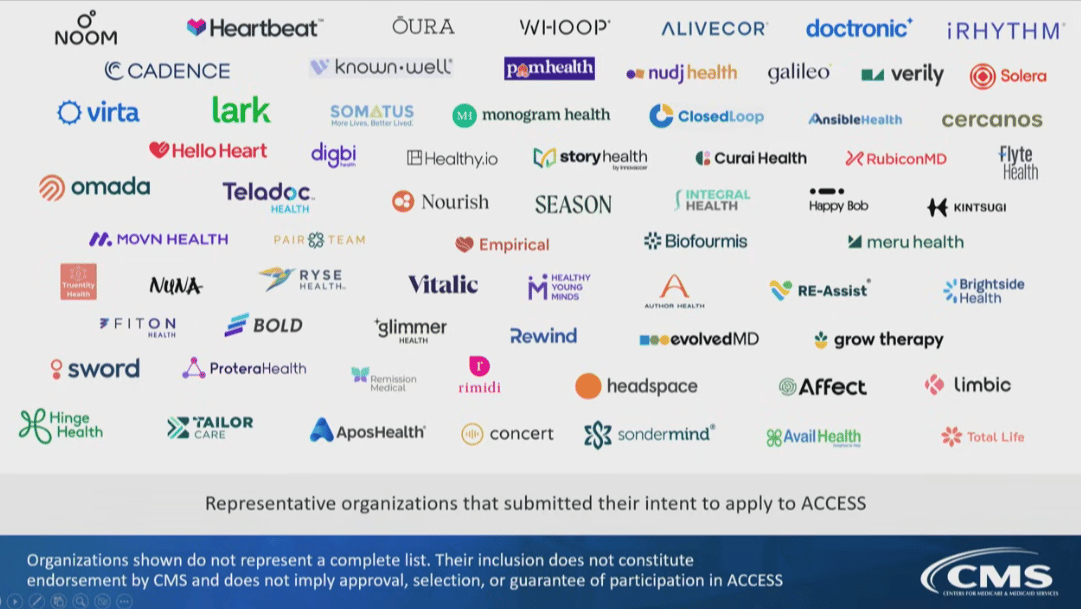 They are offering patients a chance to choose an organization to help them manage their chronic condition using technology. They are offering the ACCESS organizations reimbursement for their product solution (CMS left this flexible, but essentially tech plus clinical support in any way they believe will work, including asynchronously) and a chance to partner with (primary care) providers, who can then bill about $100 per patient per year (more if in multiple clinical “Tracks") to co-manage the care.