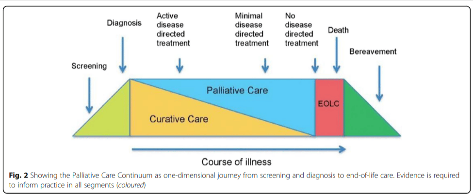 Note that “palliative care” is not the same as hospice. As palliation becomes the predominant care type, patients often choose to progress to hospice for “end of life care,” or EOLC, as above. Palliative care can be a multi-year care approach and may begin around the time of diagnosis.