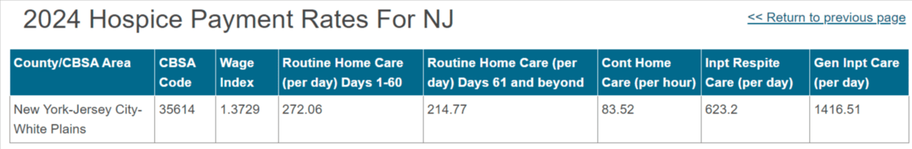 Here are the hospice payment rates for a random location, the NY metropolitan area. The free tool allows you to look up rates for 2024 in any CBSA: