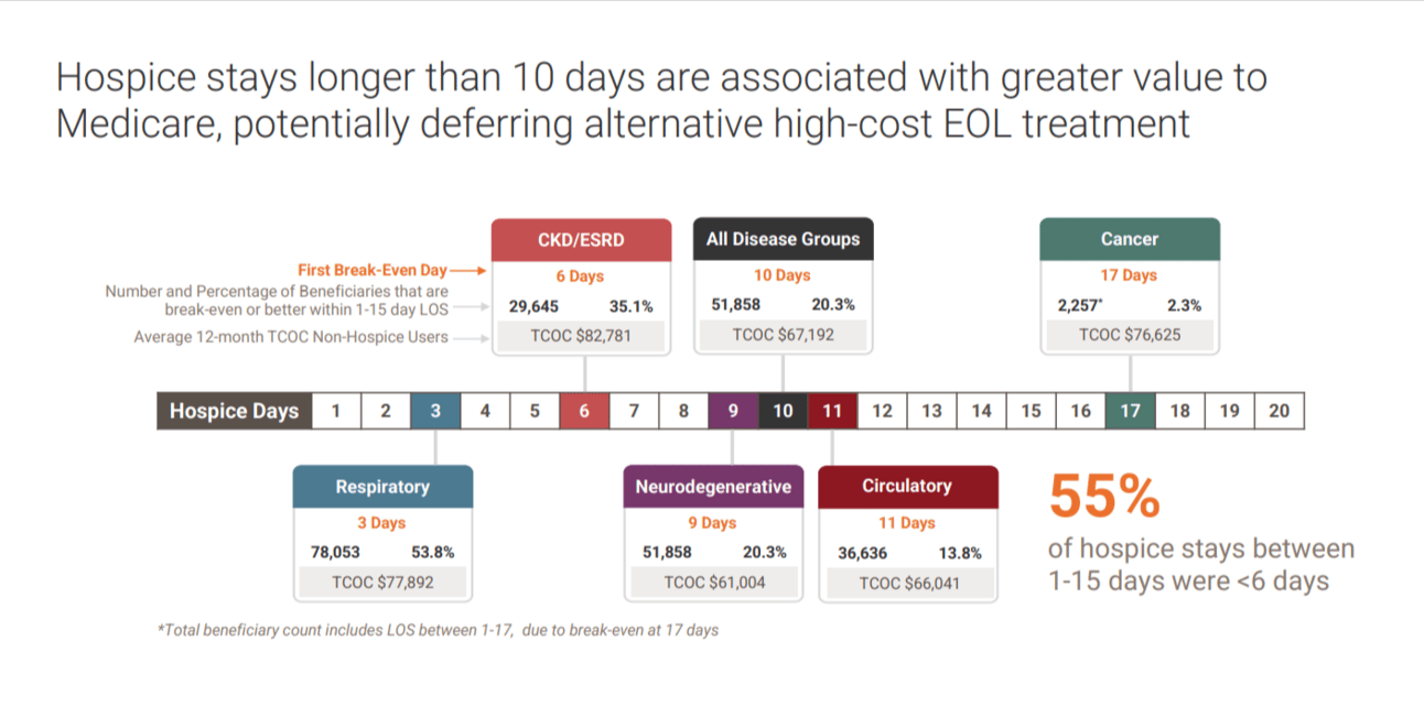 While on average, day 10 of hospice is the break-even day, with diagnostic-specific break-even days in this graphic: