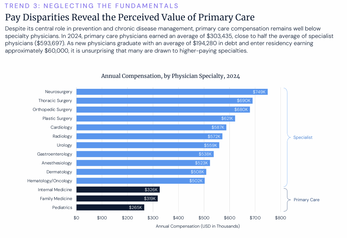 From page 41 on pay disparity by physician specialty type (another incentive problem in the American healthcare system. In the report, check out how we differ in percent of physicians in primary vs. specialty care in comparison to other countries.: