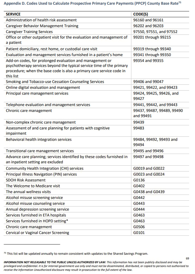 Here are the codes used to determine the base rate, from the ACO Primary Care Flex RFA: