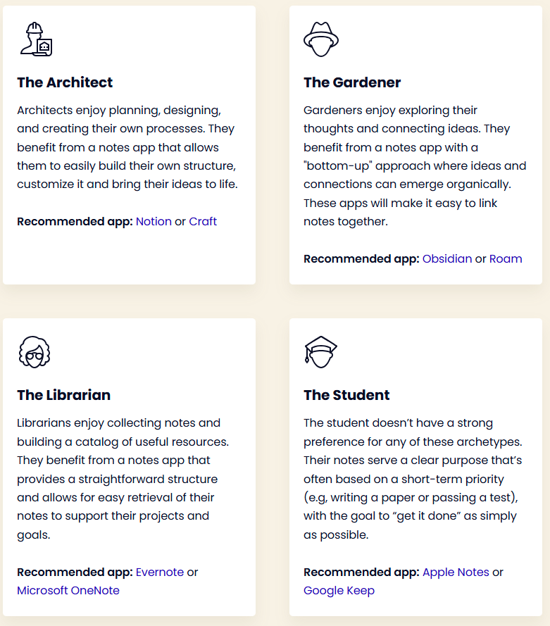 My other commentary here is I think the “The Librarian” and “The Student” apps are better for task management and quick idea capture that can then be sent to your second brain. I think they fall short when it comes to functioning as “second brains” themselves. However, Evernote is far superior to OneNote in my opinion, and Evernote is even Tiago’s second brain tool of choice. (Both Evernote and OneNote are mostly paid options for any real functionality.)