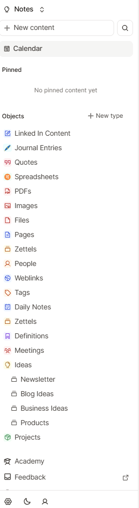 Capacities lets you create natural connections between the various types of knowledge and content you add. Anything you put into Capacities is first entered as an “object” by type. You can choose any of their options or create your own. “Objects” are things like “pdfs,” “audio files,” “ideas,” “tags,” “people,” etc.
