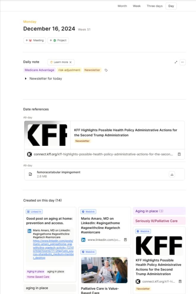 I can then click any of those “objects” and drill into the linked content. If I click on the “December 16, 2024” object, it opens a page that shows me everything I added that day, including anything I saved, linked, wrote, etc. Here’s a snapshot of that day 👇