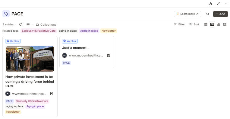 It tells me related tags where I may find other relevant/connected information based on other tags I added to one of the articles. Tags can be broken into “collections” too, so if I have been pulling info and notes on PACE for a while and then start to go through them to start a project, I can make a “collection” and name it something like “PACE article comparing PACE to DSNP,” for example, and that would separate out in one visual the articles specific to that subtopic if I clicked on that “collection.”