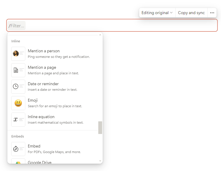 Then I click ‘/’ inside the blank sync block and the menu comes up again: