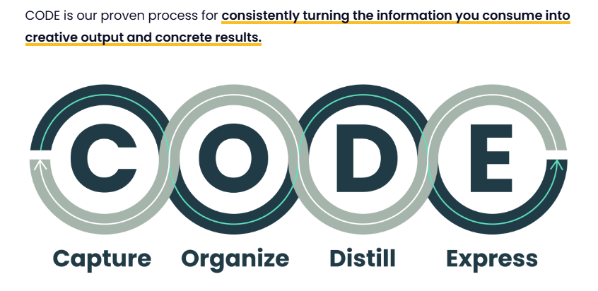Knowledge workers should be able to “CODE,” or capture relevant content and ideas, organize AND link them for later use and safe keeping (remember, our brains are for “having ideas, not holding them”—David Allen,) distill content down to the most actionable, concise, and useful notes that are original outputs, and express themselves in new and valuable ways.