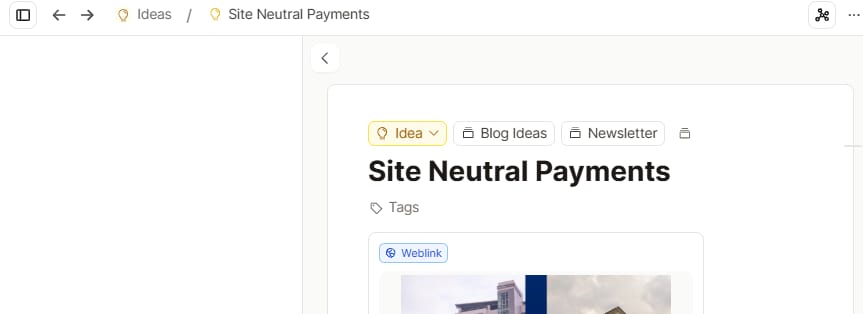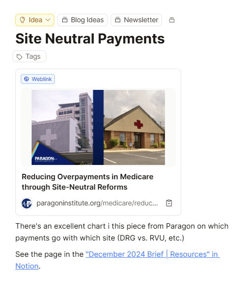 Here’s an “idea” object I made about site neutral payments. 👇 Note there are also links to other content inside this “idea” page that I added when I was saving the idea and link. I even linked a Notion database that I turned into a “Notion Site” with one click, because there’s content in there that’s connected to this.