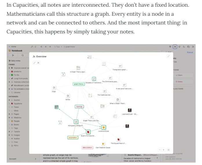 I’ve been saving content, ideas, notes as they come to me in Capacities for that new project I started in Notion today. I tag things that might relate to each other and write notes and try to link them to what I’ve saved where it makes sense. Capacities is building me a “graph” in the background, which I hope to use to help build the article.